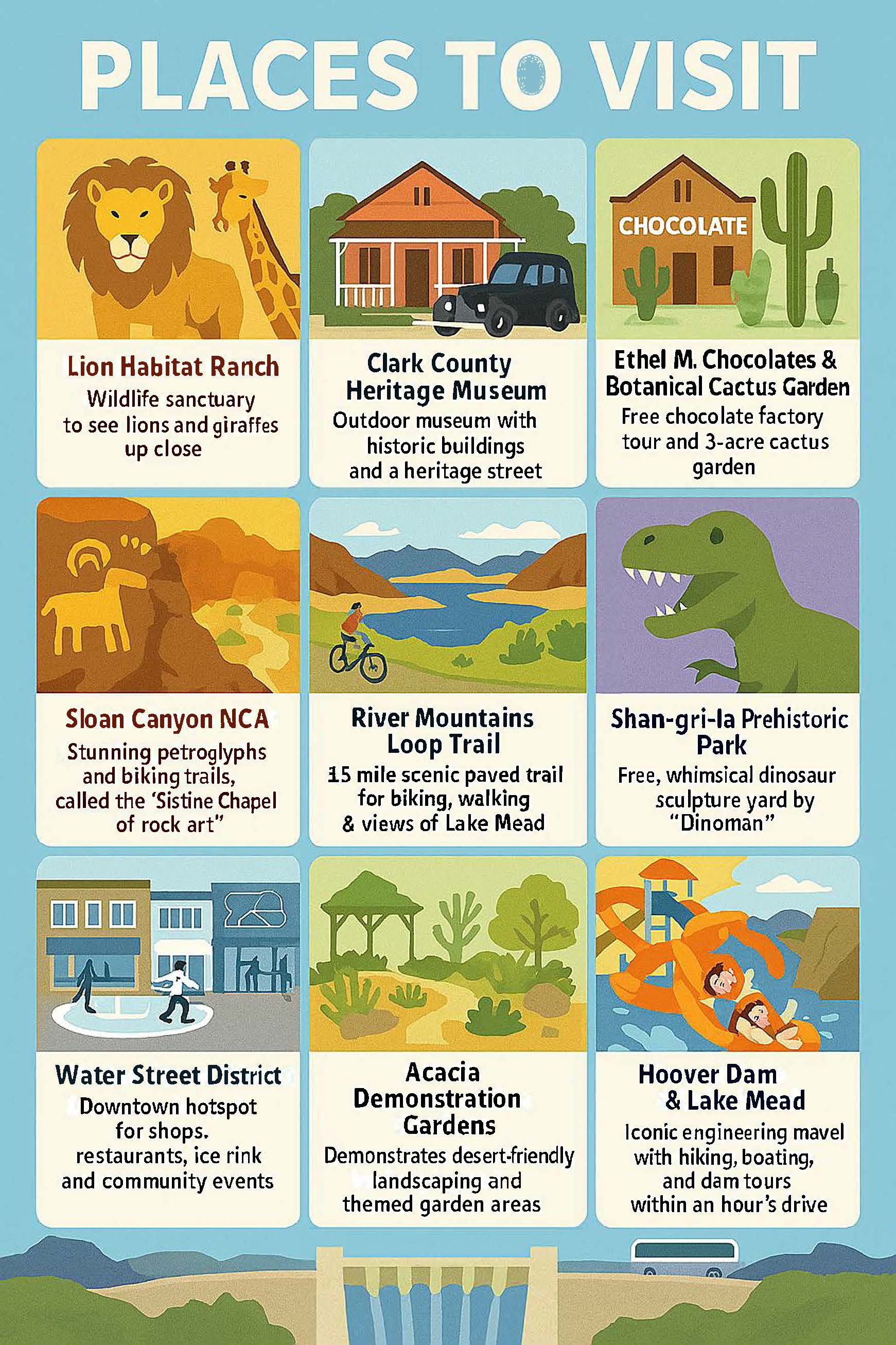 Lion Habitat Ranch – Wildlife sanctuary to see lions (and giraffes) up close Clark County Heritage Museum – Outdoor museum with historic buildings and a heritage street Ethel M Chocolates & Botanical Cactus Garden – Free chocolate factory tour and 3-acre cactus garden Sloan Canyon NCA – Stunning petroglyphs and hiking trails; called the “Sistine Chapel of rock art” River Mountains Loop Trail – 35-mile scenic paved trail for biking, walking & views of Lake Mead Shan‑gri‑la Prehistoric Park (“Dinosaur House”) – Free, whimsical dinosaur sculpture yard by “Dinoman” Water Street District – Downtown hotspot for shops, restaurants, ice rink, and community events Acacia Demonstration Gardens – Demonstrates desert-friendly landscaping and themed garden areas Cowabunga Bay Water Park – Seasonal water park with slides, wave pools, and lazy rivers Hoover Dam & Lake Mead – Iconic engineering marvel with hiking, boating, and dam tours within an hour’s drive